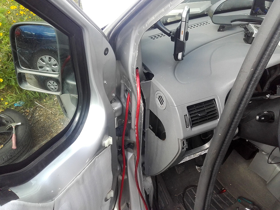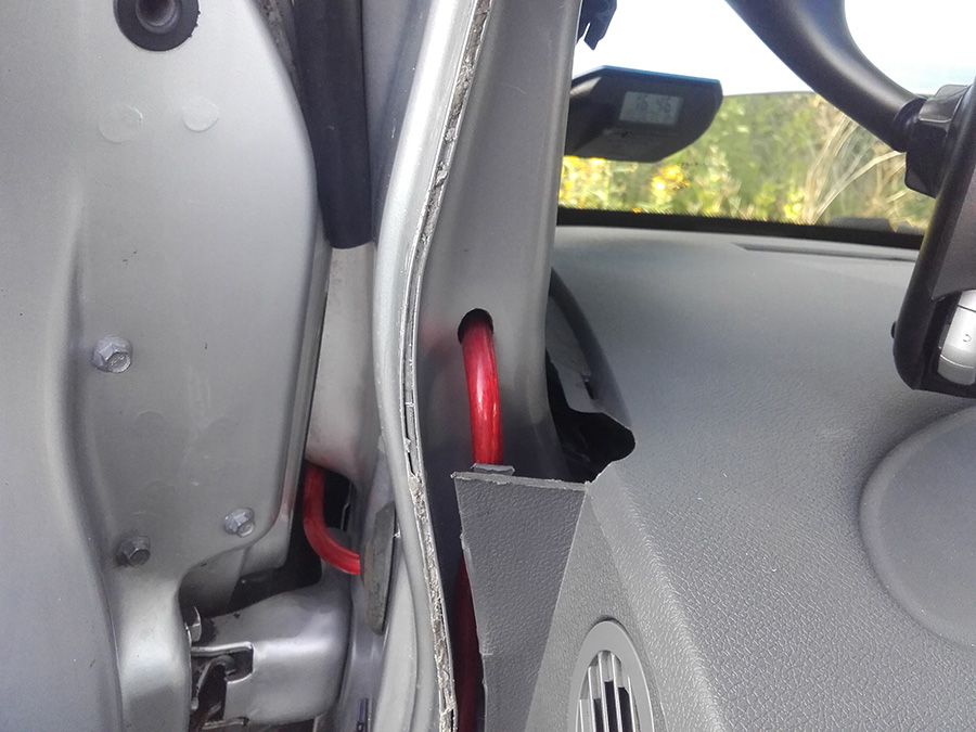 When searching for service holes, found two with rubber caps below wiper`s arms area. Unfortunately, they aren`t so useful. Didn`t remember to take micro endoscope camera with me to check how it is inside, but access to cabin interior from there was not possible in few attempts. So, I skip that way and use the solution shown in the pictures above. With drill I`ve made one additional hole in the side pillar and ta daa.