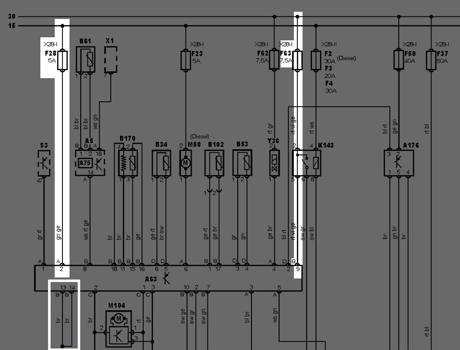 Fuse F28 was on place and required voltage can be measured on pin A2. But then on pin B9 there was nothing.
