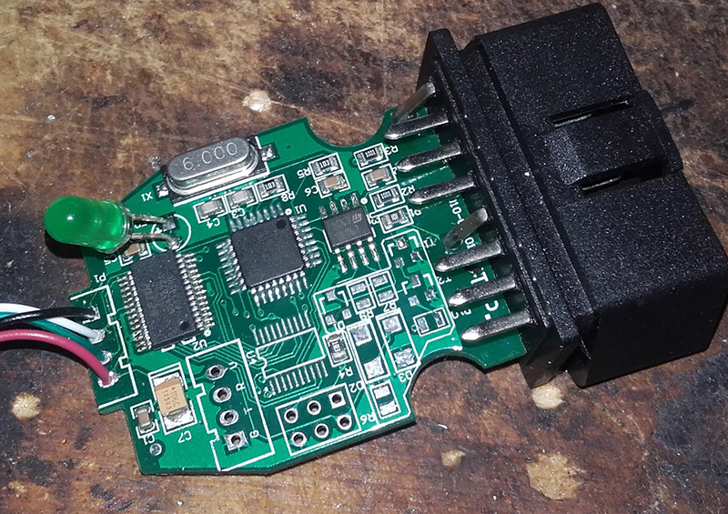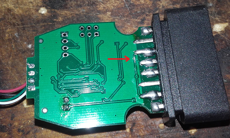 Here, just to mention that two pins on the back side of the board are tight together. That is number 7 (K-line) and pin 3 (user application). And to prevent some strange behave I cut the connection: (100% sure you can go ahead without it)