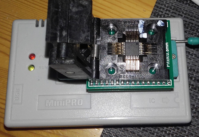 - then put on programmer (Mini Pro TL866 in my case) via good TQFT32 socket: