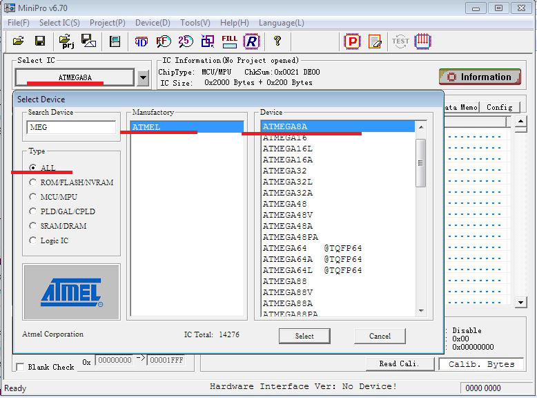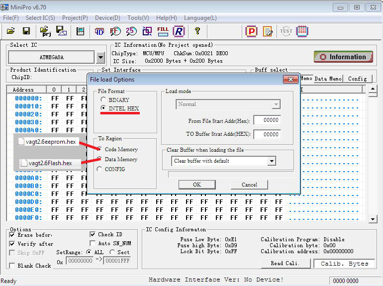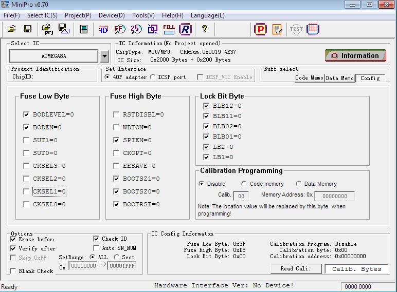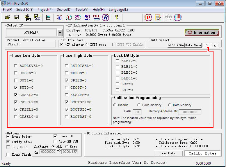 - after right chip is chosen, the fuses are automatically set. All data is fill with FF FF …