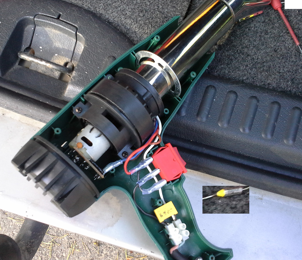 | I bought that Airgun from LIDL maybe year and half ago and recently it.. die. The reason was.. that stupid thermo-fuse (yellow one). Removing it, and clamp the heating wire straight to the same spot where it was and voila - we`re back in business. | Преди година и половина закупих от LIDL този пистолет за топъл въздух който реши в един прекрасен момент да издъхне. Оказа се термо бушона. Разкарах го, и стегнах реотана направо на негово място. Все още работи без проблем. |